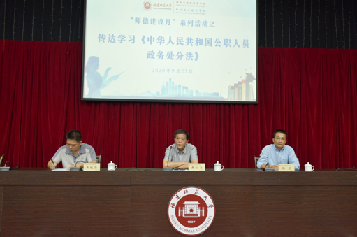 网络与继续教育学院、职业技术教育学院召开全院教职工大会传达学习《政务处分法》。会议提出,要进一步提高政治站位,以习近平新时代中国特色社会主义思想为指导,学深悟透《政务处分法》精神实质和要求,结合实际,融会贯通,切实提升学法、懂法、用法能力;要争当敬畏法律、依法履职、秉公用权、坚持道德操守、廉洁从政从业的表率,以更高的标准和要求守护好自己的初心,牢记使命,依法依纪依规履职尽责;要强化责任担当,提高精准运用能力,把《政务处分法》贯彻落实到学院工作全过程、各环节,促进学院工作规范化、法治化,不断推进法治反腐进程,毫不松懈地把党风廉政建设和反腐败工作推向深入。