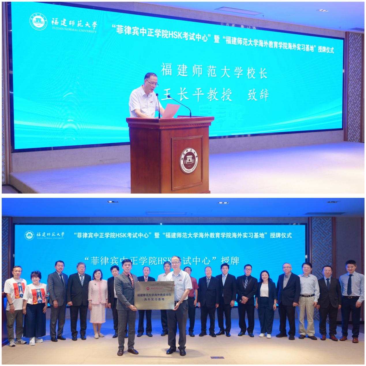 At the awarding ceremony, Wang Changping delivered a speech on behalf of FJNU. He summarized the achievements of the 20-year exchange and cooperation between FJNU and Chiang Kai Shek College and expressed sincere expectations for further collaboration. He encouraged both sides to strengthen their partnership, share talents and resources, and invited Filipino friends from all walks of life to visit the university. He emphasized the importance of building a solid foundation for Sino-Philippine friendly exchanges and boosting high-quality development of international Chinese education in the new era. Subsequently, President Wang Changping presented a plaque to the International College of Chinese Studies at FJNU, marking the establishment of the Overseas Internship Base.