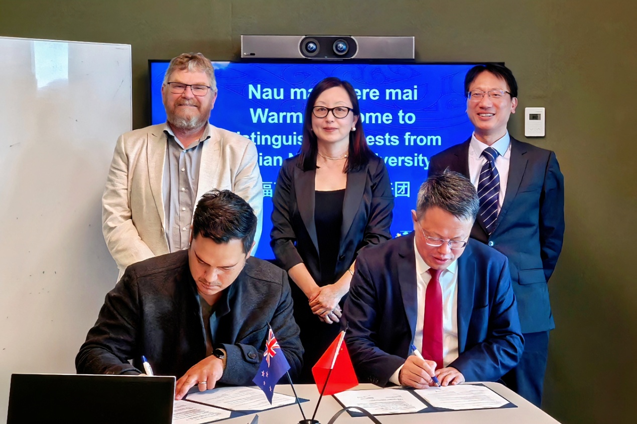 The delegation first visited Massey University, where they met with Vice-Chancellor Terry Maguire-Daley and the university's management team. Both sides reviewed a decade of successful collaboration in student joint training, faculty and research exchange, and agreed to continue promoting student exchanges, joint graduate training, and academic visits. They also signed a cooperation letter of intent for joint training programs in journalism and communication. The delegation met with Zhou Li, Counselor of the Culture and Education Office at the Chinese Consulate General in Auckland, to discuss FNU's talent recruitment policies. At the New Zealand ‘Belt and Road’ Promotion Association, they learned about successful school-enterprise cooperation practices, providing valuable insights for FNU's upcoming Maritime Silk Road International Industry-College-Institute Cooperation Conference.
