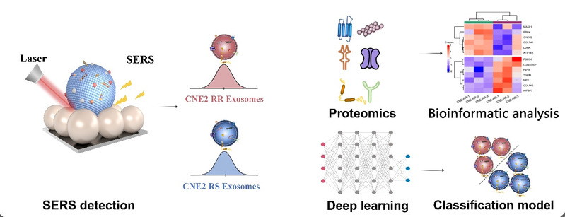 Recently, Professor Lin Duo and Professor Feng Shangyuan's team from College of Photonic and Electronic Engineering employed the surface-enhanced Raman spectroscopy (SERS) combined with proteomics to profile the characteristic spectral patterns of exosomes secreted from self-established nasopharyngeal cancer (NPC) radioresistance cells for the first time and revealed specific variations of proteins expression during radioresistance formation, including LDH, COL7A1, and COL1A2. Bioinformatic analysis shows that COL1A2 is negatively associated with DNA repair scores and DNA repair-related genes with an unfavorable prognosis in NPC. Furthermore, by extracting and analyzing exosome spectrum data with deep learning algorithms, an effective diagnostic model was generated to discriminate between radiotherapy-sensitive and radiotherapy-resistant exosomes with an accuracy of 92.4%. The work demonstrates the promising potential of exosomes as a novel biomarker for predicting the radioresistance and develops a rapid and sensitive liquid biopsy method that might provide a personalized and precise strategy for clinical NPC treatment.