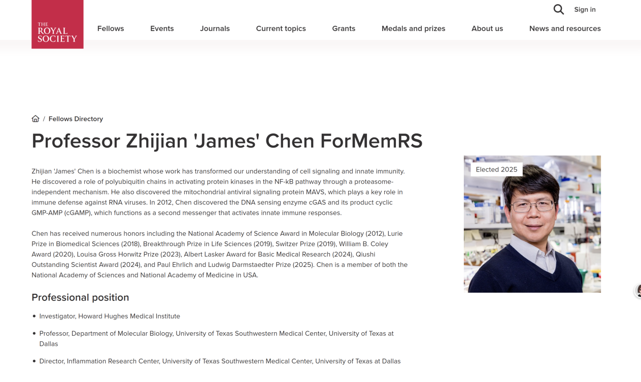 Through its rigorous annual election process, the Royal Society continues to honor exceptional individuals who have made lifelong contributions to science. Dr. Zhijian Chen’s election as a Foreign Fellow reflects his transformative impact on biomedical research and his enduring legacy in the scientific community.