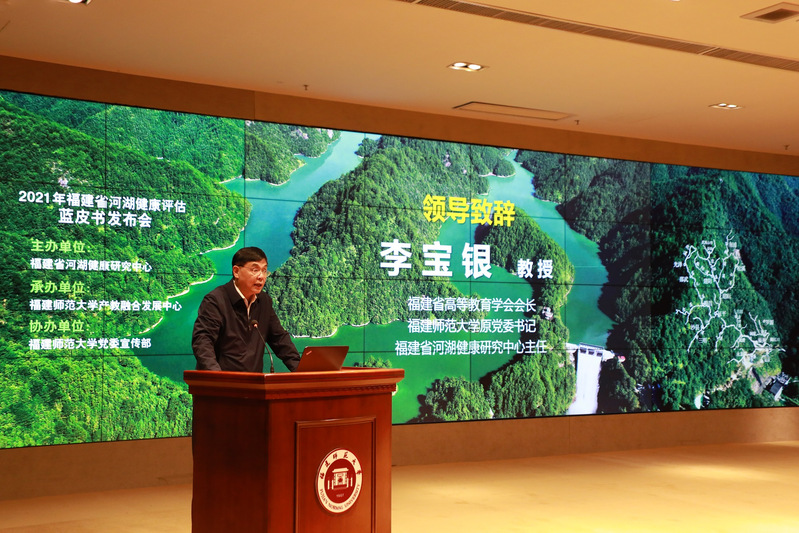 On November 10, the 2021 Fujian River and Lake Health Assessment Blue Book Launch Conference and Cross-sector Exchange Meeting of “Healthy Rivers and Lakes and Happy Dialogues”, hosted by Fujian Research Center for River and Lake Health, undertaken by the Integrated Development Center for Industry and Education of FNU and co-organized by the Publicity Department of FNU, was held at the Hongda Hall on Qishan Campus of FNU. Lv Mengjing, deputy director of the Committee for Population, Resources and Environment of the CPPCC Fujian Provincial Committee, Chen Shuishu, deputy director-general of Fujian Provincial Department of Water Resources, Xu Wei, deputy director-general of Fujian Provincial Department of Ecological Environment, Pan Yuteng, secretary of FNU Party Committee, Li Baoyin, president of Fujian Association of Higher Education and director of Fujian Research Center for River and Lake Health, representatives from such departments as the Members’ Studio of the General Office of the CPPCC Fujian Provincial Committee, Fujian Provincial Department of Natural Resources, Fujian Provincial Department of Housing and Urban-Rural Development, and Fujian Provincial Department of Agriculture and Rural Areas, representatives from research institutions such as the Chinese Research Academy of Environmental Sciences, Fujian Provincial Investigation, Design and Research Institute of Water Conservancy and Hydropower, Fujian Provincial Research Academy of Environmental Sciences, Fujian Provincial Research Academy of Water Resources and Hydropower, Fujian Provincial Institute of Freshwater Fisheries, representatives from such universities as Xiamen University, Fuzhou University, Fujian Agriculture and Forestry University, Fujian Polytechnic Normal University, Fujian University of Technology, Minjiang University, representatives from enterprises such as Beijing Enterprises Water Group Limited and Fuguang Water Technology Co., Limited, journalists from nearly 20 news media such as People's Daily, Guangming Daily and Xinhua News Agency, as well as representatives of teachers and students of FNU attended the release conference, which was held both online and offline simultaneously.