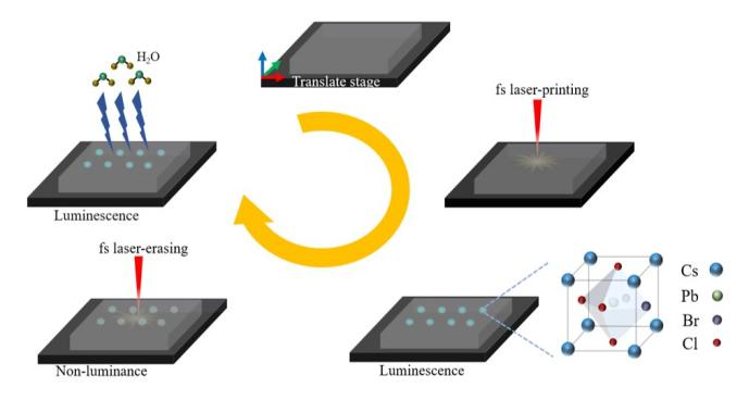 To address these concerns, the research team report that CsPb(Cl/Br)3 PeQDs can be generated or erased in specially designed transparent glass via fs laser printing without the requirement of heat-treatment. More importantly, humidity is found to be able to induce spontaneous recovery of PeQDs decomposed by laser irradiation. By placing the laser-erased glass in the air for a certain time, photoluminescence in the erased region can be recovered without further heat-treatment, achieving reversible cryptographic reading and repeatable erasing/refreshing of multimodal information encryption.