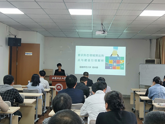 杨林香教授结合当前国内外形势、舆论环境和意识形态相关重要会议,深刻解读了习近平总书记系列讲话精神,阐述了新形势下做好社会主义意识形态工作的重大意义和时代内涵,强调要充分认识加强意识形态领域工作的重要性与紧迫性,提出要着力建设具有强大凝聚力和引领力的社会主义意识形态。她表示,高校作为意识形态建设的前沿阵地,要切实做到“四个必须”:必须牢牢把握党对意识形态工作的领导权、必须主动占领互联网宣传思想工作新阵地、必须巩固全体人民团结奋斗共同思想道德基础、必须发挥好制度保障作用。