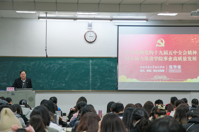 宣讲会上,张华荣教授从“准确把握全会精神”“抓好学习宣传贯彻”“科学谋划学院发展”等三个方面,结合国家、福建省和学校的有关数据和案例,对党的十九届五中全会精神进行了系统阐述,对全会提出的一系列新思想新观点新论断新要求作了深入浅出的辅导。