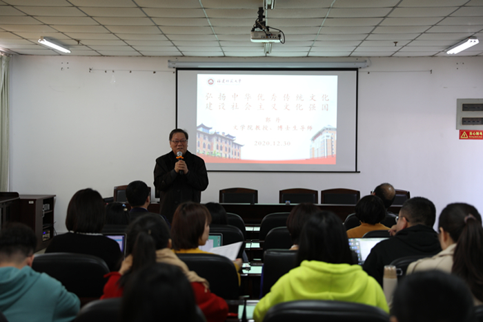 1230日下午,校党委讲师团成员、文学院博士生导师郭丹教授应邀为传播学院师生党员作以“弘扬中华优秀传统文化 建设社会主义文化强国”为主题的讲座。讲座由院党委书记郑文灿主持,全体教师党员、学生党支部支委到场聆听了讲座。